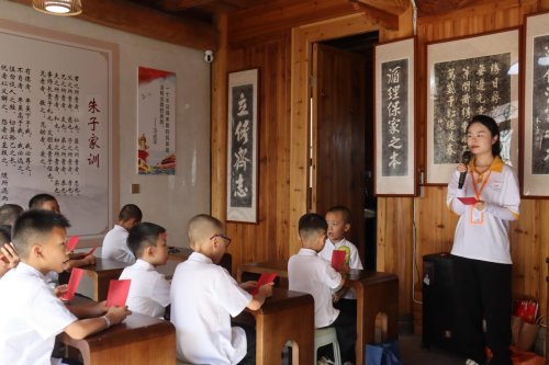 (图为“寻熹人文”实践队员在朱子学堂教小朋友齐唱歌曲《没有共产党就没有新中国》,用最质朴的歌声抒发对党的真情祝福。苏丽真/摄)