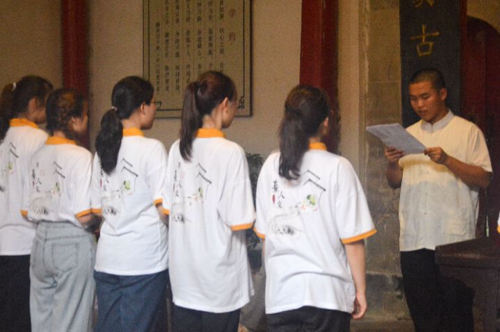 图为兴贤书院内,队员们在同文书院张老师的耐心指导下熟悉敬师礼仪式的流程,并进行排练,为这场寓意“明礼崇德,尊师尚学”的仪式做足准备。中国青年网通讯员 蔡萍仪 摄